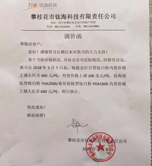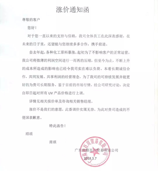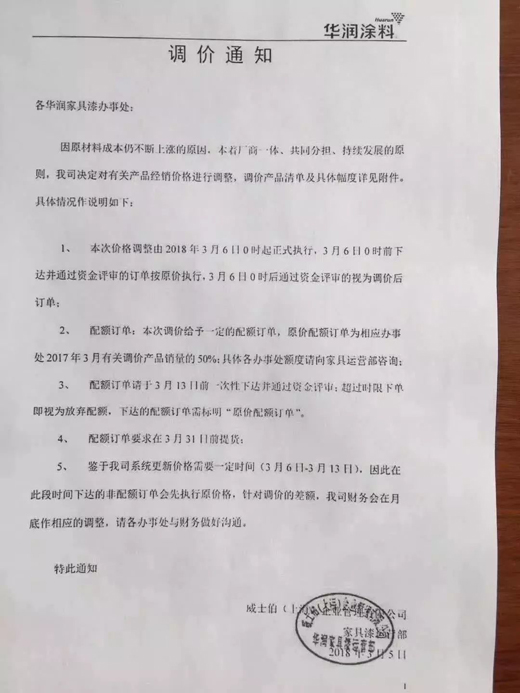 3月13日,展辰集團(tuán)在發(fā)布的“關(guān)于對產(chǎn)品銷售價(jià)格進(jìn)行調(diào)整的通知”中稱,自4月1日起對家具漆產(chǎn)品銷售價(jià)格上調(diào)5%以上(部分品種10%以上);3月15日,嘉寶莉集團(tuán)發(fā)布“2018年漲價(jià)預(yù)警通知”,包括面漆、底漆、固化劑、稀釋劑及UV類產(chǎn)品,價(jià)格上調(diào)幅度分別為7-9%、6-8%、8-12%、6-7%、20-25%;華潤家具漆于2018年3月6日0時(shí)起正式調(diào)價(jià);紫荊花漆集團(tuán)也發(fā)布通知于4月1日起正式對家具漆產(chǎn)品價(jià)格上調(diào)5%,部分上調(diào)10%。