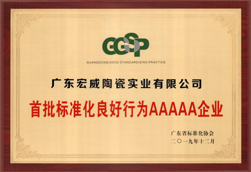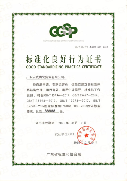多年來,威爾斯陶瓷始終積極推動企業(yè)標準化管理的建設,堅持把產品研發(fā)及技術革新工作放在企業(yè)生產經營的首要位置,積極貫徹落實“高質量、優(yōu)服務、高效益”的生產管理原則,從而順利通過了5A級標準化良好行為的評定。