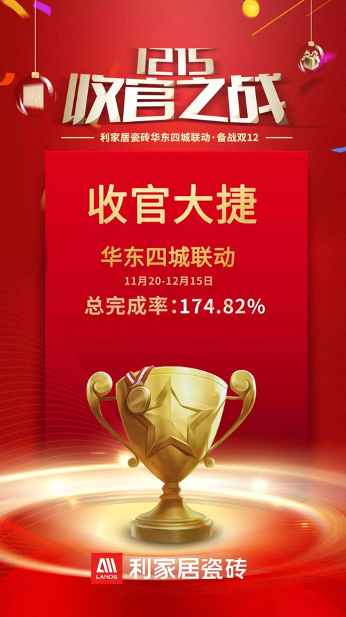 11月20日——12月15日,為期26天的利家居瓷磚“12.15 收官之戰(zhàn)”華東四城聯(lián)動促銷活動大獲成功,以174.82%完成率的佳績圓滿收官,銷量與業(yè)績雙線爆紅,品牌影響力與知名度均獲得很大的提升。