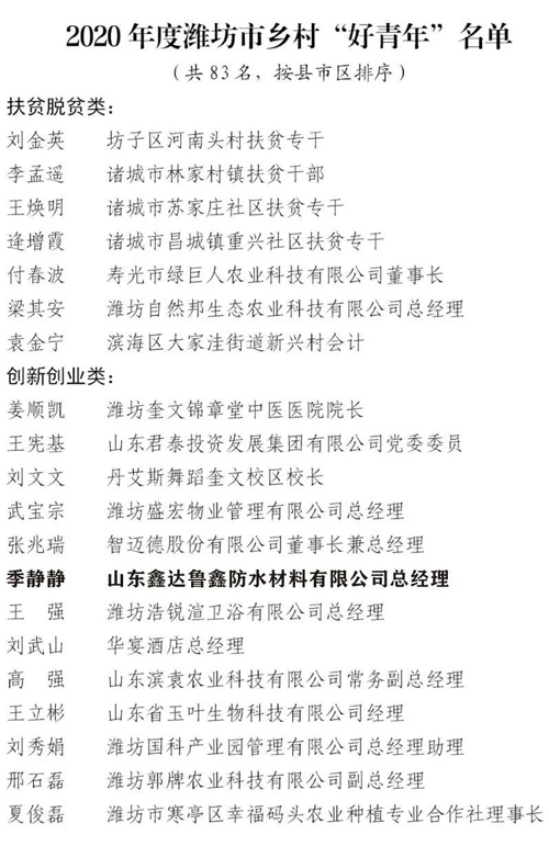 在經(jīng)由各縣市區(qū)推薦、資格審查、網(wǎng)絡(luò)點(diǎn)贊的基礎(chǔ)上,經(jīng)征求各部門意見,山東鑫達(dá)魯鑫防水材料有限公司總經(jīng)理季靜靜榮獲2020年度濰坊市鄉(xiāng)村“好青年”。