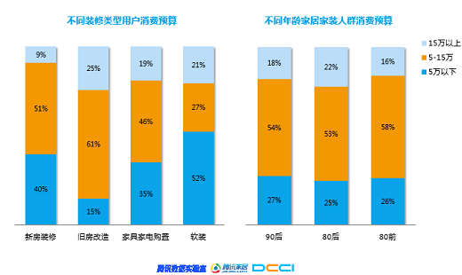 由于水電改造項(xiàng)目和拆除的需要,舊房改造通常比新房裝修需要更多的預(yù)算;對比不同年齡層家居家裝人群消費(fèi)預(yù)算,80后與90后裝修預(yù)算充足,其消費(fèi)預(yù)算在15萬以上的人群占比高于80前消費(fèi)者。