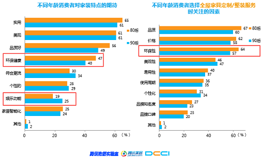 對比80后和90后對于家裝特點(diǎn)的期待,90后對于娛樂功能的期待更高,80后更關(guān)注環(huán)保;在選擇全屋家具定制/整裝服務(wù)的方面,和90后相比,80后依舊對環(huán)保健康問題的關(guān)注度更高。