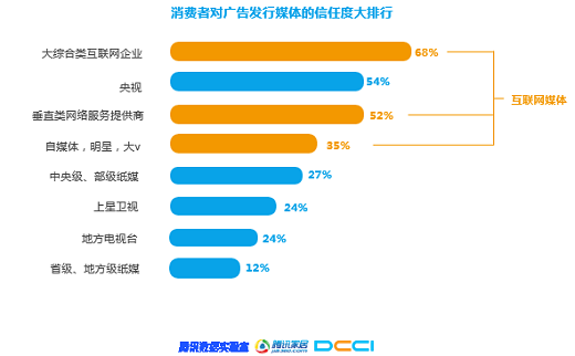 互聯(lián)網(wǎng)媒體由于其龐大的用戶群體、多樣的內(nèi)容呈現(xiàn)方式和更高的互動(dòng)性,獲得了消費(fèi)者更多青睞;其中大綜合類互聯(lián)網(wǎng)媒體獲得的信任度在廣告發(fā)行媒體信任度排名中居首位。