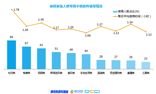 在手機(jī)軟件使用方面,社交、電商、視頻、新聞資訊類應(yīng)用是家居家裝人群最常用的四類手機(jī)軟件;社交、視頻、直播三類軟件占據(jù)了用戶最多的使用時(shí)間。