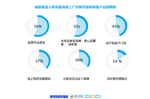 超過一半的家居家裝人群會(huì)因?yàn)閾?dān)心產(chǎn)品品質(zhì)無法保證,以及本地沒有該品牌實(shí)體店,擔(dān)心運(yùn)費(fèi)貴、保修難等問題的出現(xiàn)而放棄由線上廣告進(jìn)行購買。線上線下如何完美融合仍需解決之道。