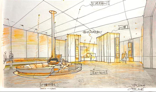 杜翔:在整個空間里面的扇子希望是一個亮點主題的東西,后面是一個背景墻,前面還有一個小的可參與性的一種展示性意圖引發(fā)。當(dāng)時我們在想整個扇面是往下面打的,我們很忌諱的是上面很亮,希望是一種裝飾性的東西,包總在設(shè)計的時候,他希望整個扇子是很輕盈的感覺,當(dāng)然這個輕盈的感覺我們更希望它是有一種在扇骨的空間做一些細的燈帶的東西。