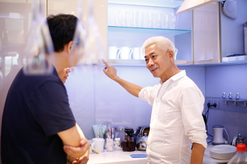 ▲梁少禧向客人介紹迪信的家裝工業(yè)化成果