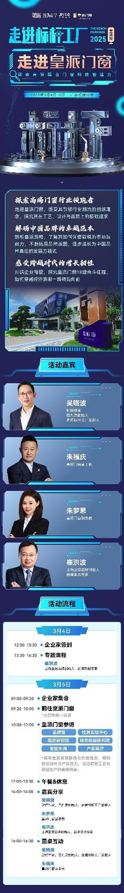 3月5日吳曉波將帶領(lǐng)百位企業(yè)家一同走進(jìn)皇派門窗,探索高端隔音門窗科技智造力,解碼中國(guó)門窗品牌是如何憑借敏銳的市場(chǎng)洞察力,不斷拓展品牌版圖,逐步成為中國(guó)門窗品牌的卓越范本,同時(shí)吳曉波將深度對(duì)話皇派門窗掌舵人,探究皇派門窗18年來如何穿越經(jīng)濟(jì)浪潮一路領(lǐng)跑向前,引領(lǐng)美好人居提檔升級(jí)的標(biāo)桿力量。