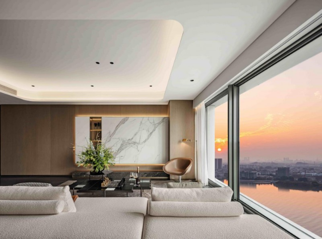 設(shè)計(jì)團(tuán)隊(duì)在本案中多處運(yùn)用了全景落地玻璃窗,將珠江河的自然畫卷最大限度引入其中,室內(nèi)也因此有了應(yīng)時(shí)而變的豐富景象。