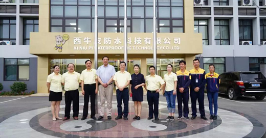 中國建筑防水協(xié)會(huì)秘書長朱冬青(左四)一行在公司董事長盧桂才(左五)等領(lǐng)導(dǎo)陪同下參觀考察西牛皮防水科技園