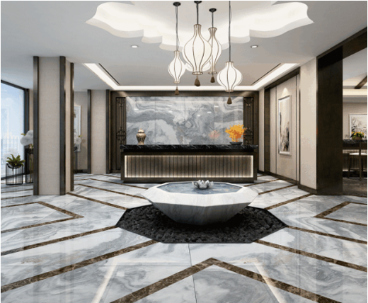 Style:組合式鋪貼適合于多種風格,鋪貼方式更為豐富大氣。通常采用顏色略深于所鋪主體瓷磚的大理石,在地面四周圍以15厘米左右的圍邊。這種鋪貼效果讓人感覺物盡其用、極致精美,更能烘托出空間氣氛的立體層次。