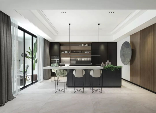 由佛山瓷磚品牌新濠大理石瓷磚的卡洛尼灰主導,搭配一體式櫥柜,結(jié)合木紋跟大理石,體現(xiàn)出整個空間的高級質(zhì)感,以原木做墻壁飾面,形成功能的分開。全落地窗的敞開式視覺效果,讓空間變得更大,柔和的光線創(chuàng)造出舒適的用餐氛圍。