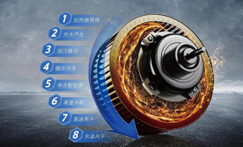 八重自動(dòng)熱水洗技術(shù),利用風(fēng)輪順時(shí)針轉(zhuǎn)動(dòng)與風(fēng)柜內(nèi)壁形成搓洗的原理,高速?zèng)_刷深度剝離油污并將殘留水分甩干排出。八重自動(dòng)熱水洗時(shí)長(zhǎng)共6分鐘:預(yù)熱階段20秒+清洗階段285秒+甩/風(fēng)干階段60秒。