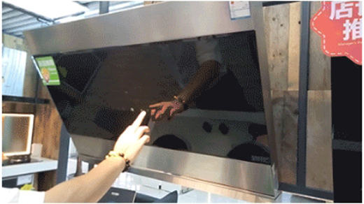 這個操作,老板電器實(shí)際用起來怎么樣呢?測試人員將手對準(zhǔn)操作面板輕輕一擺,油煙機(jī)就自動開啟了,再一擺它就加大了排煙速度(即一鍵提速),要關(guān)閉一鍵提速就再次用手掌對準(zhǔn)操作面板一擺,便可自動關(guān)閉,其感應(yīng)非常靈敏,使用超級方便。