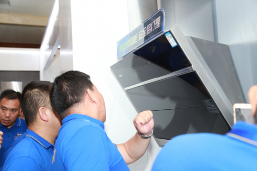 產(chǎn)品發(fā)布后,與會嘉賓和運營商來到會場外的四季沐歌廚電新品展廳,實地感受颶風606油煙機的性能實力。大家在解說員的介紹下觀摩、操控,對左右雙電機、體感揮手操控、自動攏煙屏、三重油煙分離等特色功能深入細致地進行了解和體驗。