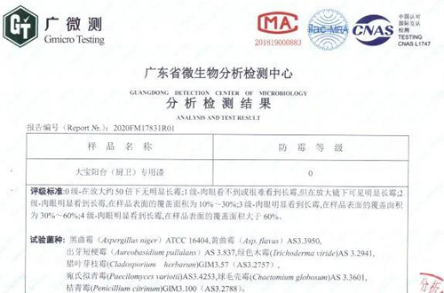 在防霉方面,大寶陽臺(tái)(廚衛(wèi))專用漆被廣東省微生物分析檢測中心分析檢測防霉等級(jí)為0,可高效抵御8種霉菌滋生,呵護(hù)墻面長久靚麗。