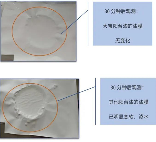 此外,大寶漆還在實(shí)驗(yàn)室對(duì)大寶陽臺(tái)廚衛(wèi)專用漆作簡易對(duì)比,30分鐘后觀測發(fā)現(xiàn)漆膜無變化,證明陽臺(tái)漆的漆膜透水性強(qiáng)。