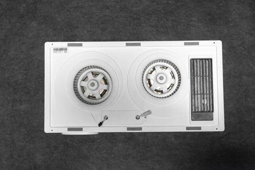 開箱部分直接跳過,來看看產(chǎn)品本身吧。浴霸共分為主體和面板兩部分,主體上是兩個碩大的電機(jī),雙電機(jī)可同時工作,暖風(fēng)和換氣同時進(jìn)行,這樣冬天在洗澡的時候就不會又悶又熱了。