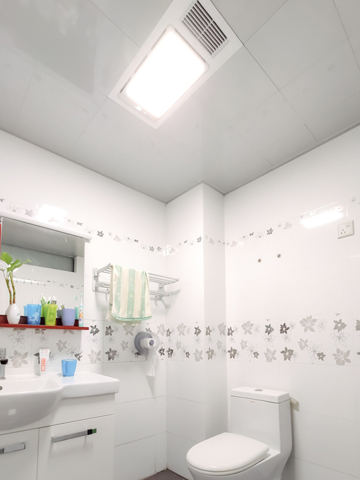 最常用到的功能當(dāng)然就是照明了,由于舊浴霸也支持照 明功能,所以這個衛(wèi)生間我一直沒有另外裝吸頂燈,全靠浴霸的燈來進(jìn)行照明。但舊浴霸采用的是傳統(tǒng)的燈管,又昏暗又容易壞,這幾年都不知道換過幾次了,而這個新浴霸采用的是12W的LED照明燈,光源達(dá)14.5寸,能輕松把整個衛(wèi)生間照亮,亮堂堂的感覺真好。