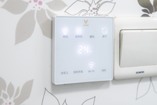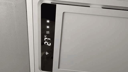 控制面板看上去比較顯檔次,LED屏可以實(shí)時顯示環(huán)境溫度,同時還有照明、自然風(fēng)、暖風(fēng)、換氣、自定義場景和延時關(guān)機(jī)六個功能可供選擇。