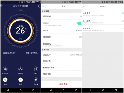此外,云米互聯(lián)網(wǎng)浴霸還有自定義功能,有點(diǎn)類似于手機(jī)上的智能場景,它可以根據(jù)你的使用習(xí)慣,在手機(jī)APP上選擇不同的功能組合,一鍵同時開啟。