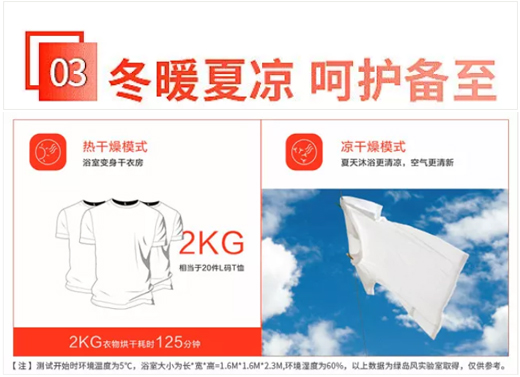 除了冬天常用的取暖模式和夏天的吹風(fēng)模式外,還配置了人性化的干燥和涼風(fēng)模式。