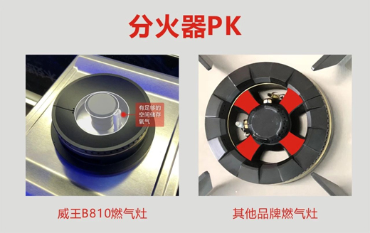 氧氣進得來,還要留得住,所以威王設計了聚氧火蓋,保證有足夠的空間儲存氧氣,并補充燃燒。供氧+存氧才能雙重保證燃燒的氧氣。而有的品牌中間儲氧不通暢,供氧阻隔了,這樣的灶具很容易出現(xiàn)紅火、黃火。