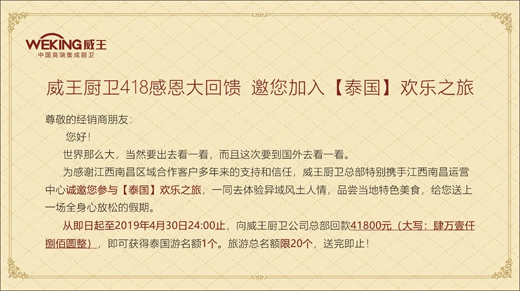 為感謝江西南昌區(qū)域合作客戶多年來的支持和信任,威王廚衛(wèi)總部特別攜手江西南昌運(yùn)營中心在2019年4月份開展了贈(zèng)送【泰國游】活動(dòng),南昌各區(qū)域客戶參與熱情高漲,本次活動(dòng)所收獲成效也遠(yuǎn)超預(yù)期。