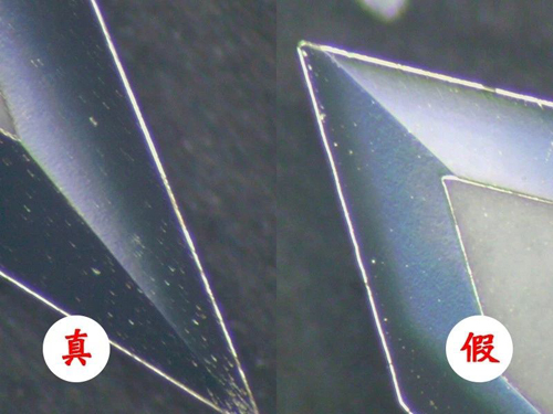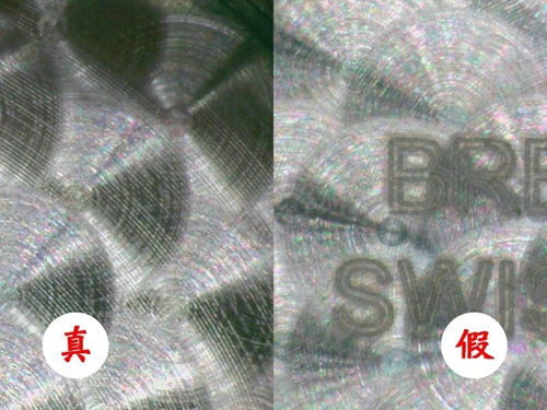 仿品分針開刃處偏位,正品兩端則剛好勻稱,兩者工藝相比較,不言而喻。