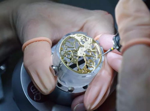 然后進(jìn)行機(jī)心零件組裝和加油,這個(gè)過程是一邊組裝一邊加油。點(diǎn)油過程看似簡單,但其實(shí)要注意到的地方非常的多,首先必須確認(rèn)每個(gè)零件、機(jī)板、寶石是否清潔,殘留的污垢必須確實(shí)清除,否則會(huì)讓點(diǎn)油之后的效果大打折扣。而且每個(gè)零件所上的油品都不一樣。如ETA機(jī)心,動(dòng)力系統(tǒng)建議使用稍黏的油(D5油),齒輪系統(tǒng)則使用較稀的油(9010油),擒縱系統(tǒng)建議使用專用油(941油),絕對(duì)不能一油到底,所以,這個(gè)過程也非常耗時(shí)耗力。