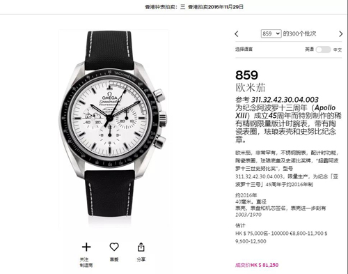 2016年11月29日富藝斯香港鐘表拍賣,這款腕表成交價(jià)為81250港元。