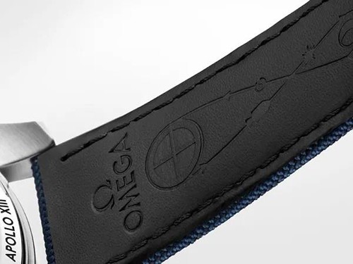 表帶則選用藍(lán)色尼龍表帶,這款表帶內(nèi)側(cè)壓印有“阿波羅”13號任務(wù)航行軌道。