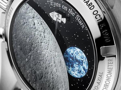 最獨(dú)特的設(shè)計(jì)還得看腕表背面,前兩款限量版的背面設(shè)計(jì)是穿著太空服的史努比,而這次則飾以微結(jié)構(gòu)金屬化技術(shù)制作的月球背面影像。
