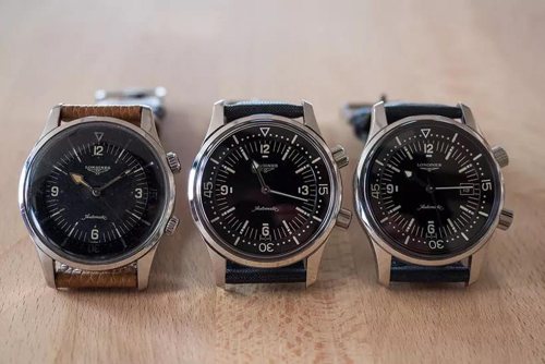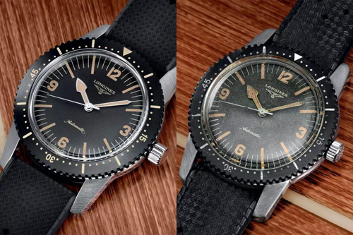 其中浪琴在1959年推出第一只潛水表,口徑40MM的Longines Nautilus Skin Diver Ref.6921(上圖右邊為元祖,左邊為現(xiàn)代款)