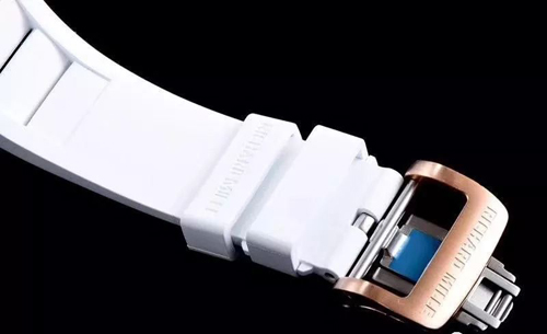 表帶采用馬來西亞頂級橡膠材料制作而成,㬵帶的品質(zhì)可以與原裝互換。精鋼折疊扣經(jīng)過拉絲處理,質(zhì)感細(xì)膩。表扣采用鍍玫瑰金處理,上面刻有理查德英文Logo,字體大小深度把控的很棒!