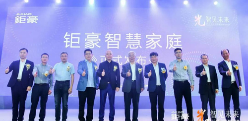 鉅豪智慧家庭發(fā)布儀式上,鉅豪集團(tuán)董事長(zhǎng)許建龍、中國(guó)照明電器協(xié)會(huì)理事長(zhǎng)陳燕生、清華大學(xué)社會(huì)治理與發(fā)展研究院/北京大數(shù)據(jù)研究院秘書長(zhǎng)吳言動(dòng)、國(guó)家半導(dǎo)體照明工程研發(fā)及產(chǎn)業(yè)聯(lián)盟副理事長(zhǎng)竇林平、中山市橫欄鎮(zhèn)黨委委員趙國(guó)明、阿里云IoT業(yè)務(wù)總監(jiān)方評(píng)、上海海思半導(dǎo)體技本有限會(huì)司高級(jí)解決方案專家張照鵬、中山市貿(mào)促會(huì)主任劉鴻漸、廣東省照明電器協(xié)會(huì)會(huì)長(zhǎng)吳文峰等共同上臺(tái),正式啟動(dòng)鉅豪智慧家庭。