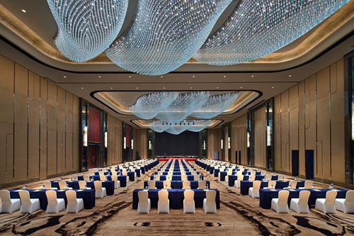 整個(gè)宴會(huì)空間大氣簡(jiǎn)約,有丹頂鶴的紅,泥土的灰,猶如蘆葦般筆挺錯(cuò)落的墻面線(xiàn)條,菱形拼貼的鏡面如同水面映射著陽(yáng)光。天花的水晶吊燈,如同成群的魚(yú)兒游戲在蘆葦環(huán)繞的濕地淺灘中,周邊鶴群棲息,充滿(mǎn)動(dòng)感,表現(xiàn)齊齊哈爾的自然生態(tài)及生生不息的美好寓意。
