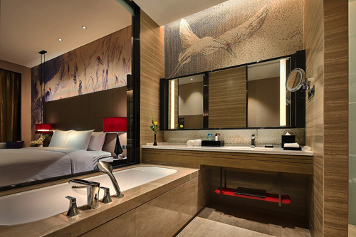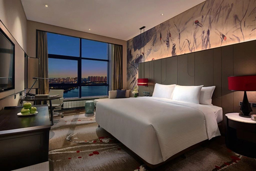 客房空間開(kāi)闊,造型自由靈動(dòng),墻身圖案以“鶴”為主題,運(yùn)用水墨的手法展現(xiàn)著鶴群在水邊嬉戲的場(chǎng)景,床背軟包線(xiàn)條如蘆葦般交織,隨風(fēng)搖曳。棕灰相間點(diǎn)綴著點(diǎn)點(diǎn)紅色的地毯,舒適簡(jiǎn)潔的家具,處處為您營(yíng)造出溫暖如巢、舒適寧?kù)o的休息環(huán)境。