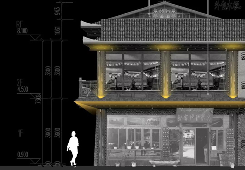 項目入口門樓碉房為石木結(jié)構(gòu),外形端莊穩(wěn)固,風格古樸粗獷,蘊含濃郁的藏族建筑風情。因此該區(qū)域照明采用自下往上的照明方式,表現(xiàn)石材的質(zhì)感,體現(xiàn)古樸粗獷的風格。在通道上的冉冉的火炬裝飾燈,增加空間的照明層次,體現(xiàn)藏族人民的熱情。