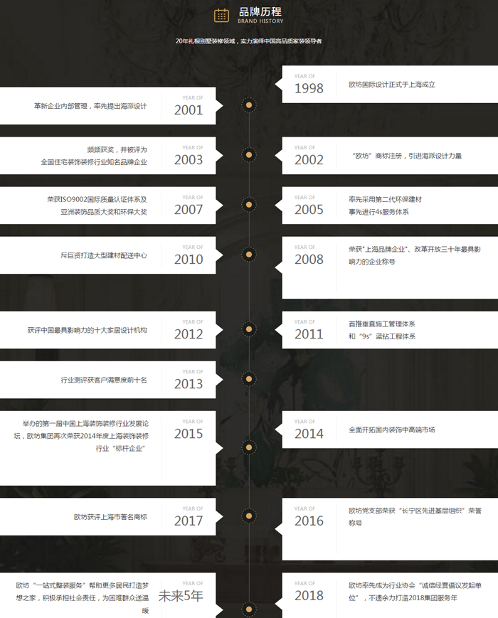 擁有國(guó)家級(jí)裝修與設(shè)計(jì)資質(zhì),通過(guò)ISO9002國(guó)際質(zhì)量認(rèn)證體系。匯聚國(guó)內(nèi)外頂尖設(shè)計(jì)師及王牌施工團(tuán)隊(duì),堅(jiān)持標(biāo)準(zhǔn)化環(huán)保施工,工程絕不外包,獨(dú)有黨建特色客服體系,歐坊正在成為中國(guó)最具影響力,集設(shè)計(jì)、施工、建材、設(shè)備、軟裝,及其他配套的一體化家裝整合服務(wù)商,已榮獲“上海名牌”、“上海家裝十強(qiáng)企業(yè)”、“改革開(kāi)放三十年最具影響力企業(yè)”、“中國(guó)家裝設(shè)計(jì)影響力十大品牌”等一系列殊榮。