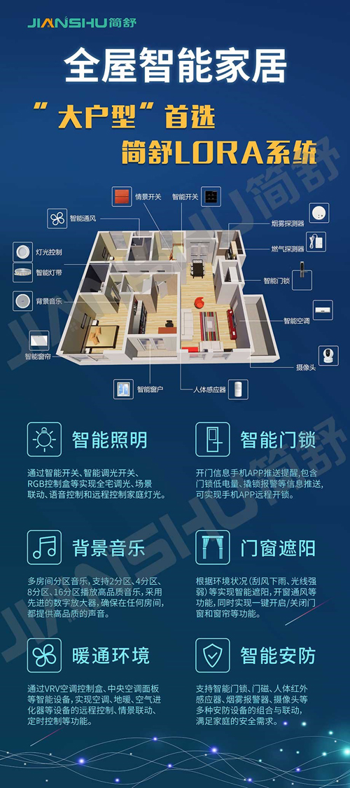 簡舒智能家居自主研發(fā)生產(chǎn)的LORA全屋智能家居系統(tǒng)成功的解決了智能家居行業(yè)多年來有線與無線之爭,整合了有線與無線智能家居技術(shù)的各項(xiàng)優(yōu)勢,別墅、復(fù)式樓等大戶型房子只需要一個(gè)LORA智能家居網(wǎng)關(guān),即可控制全屋智能家居產(chǎn)品,真正實(shí)現(xiàn)了智能家居產(chǎn)品在智能化改造升級方案中落地可行,為家庭、別墅、樓盤、酒店、辦公室等不同類型的項(xiàng)目提供一站式的解決方案。