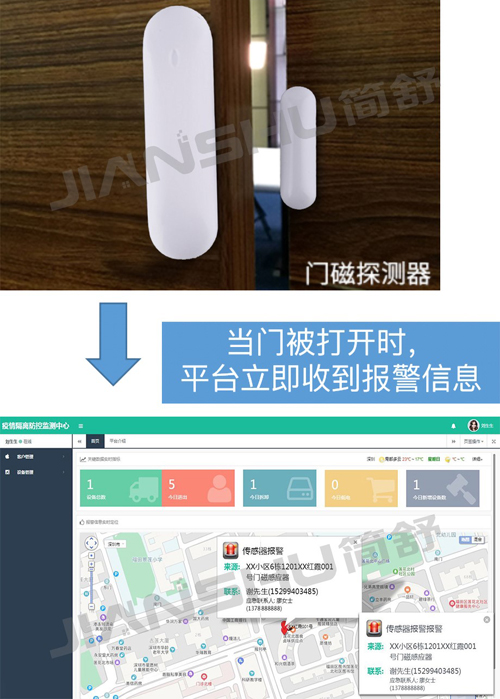 簡舒智能第一時(shí)間成立了疫情防控系統(tǒng)的研發(fā)團(tuán)隊(duì),基于對疫情防控一線的管理需求,研發(fā)生產(chǎn)了NB-IOT門磁電子封條,實(shí)現(xiàn)了“被隔離人員進(jìn)出隔離場所”的實(shí)時(shí)預(yù)警功能,達(dá)到實(shí)時(shí)監(jiān)測隔離場所人員動態(tài)的目的。